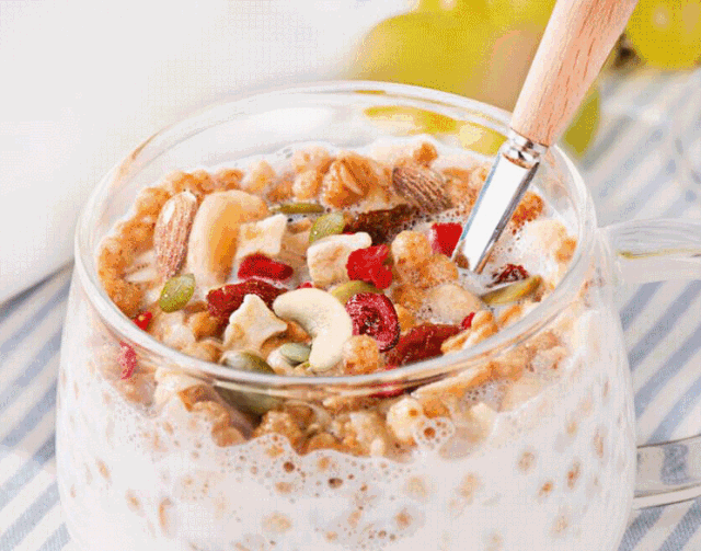 早餐是每天很重要的一餐,但是又常常由于忙碌,重要的卻往往不重視。美好的一天就從簡單而又美味的水果燕麥片開始,合二為一的水果麥片作為早餐,營養(yǎng)又美味。 水果麥片亮點在于將兩類原本營養(yǎng)價值不低的食物聯(lián)姻,使得營養(yǎng)素的種類更齊全。水果麥片中所添加的燕麥、黑麥、小麥、大麥等,維生素尤其是B族維生素和維生素E含量很高,且膳食纖維含量豐富,尤其是燕麥含有的特殊膳食纖維----β-葡聚糖,是一種具有降低膳食中脂肪的吸收、吸附多余的膽固醇等多種保健價值的成分