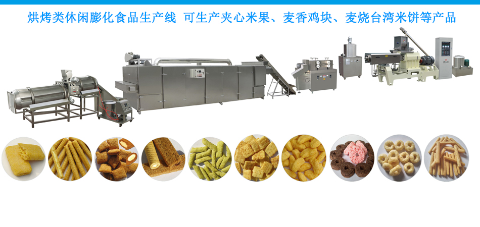 工藝流程:自動(dòng)配料-混合-擠壓熟化--壓片-預(yù)干燥-高溫醅烤-噴涂-二次干燥-冷卻-包裝。