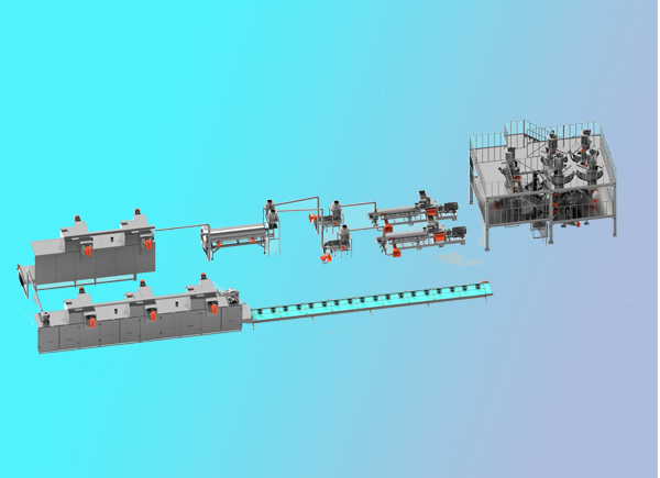 粉碎機→ 攪拌機→ 飼養(yǎng)員→ 擠出機→ 振動篩→ 鼓風(fēng)機→ 多層烤箱→ 冷卻輸送機→ 包裝機