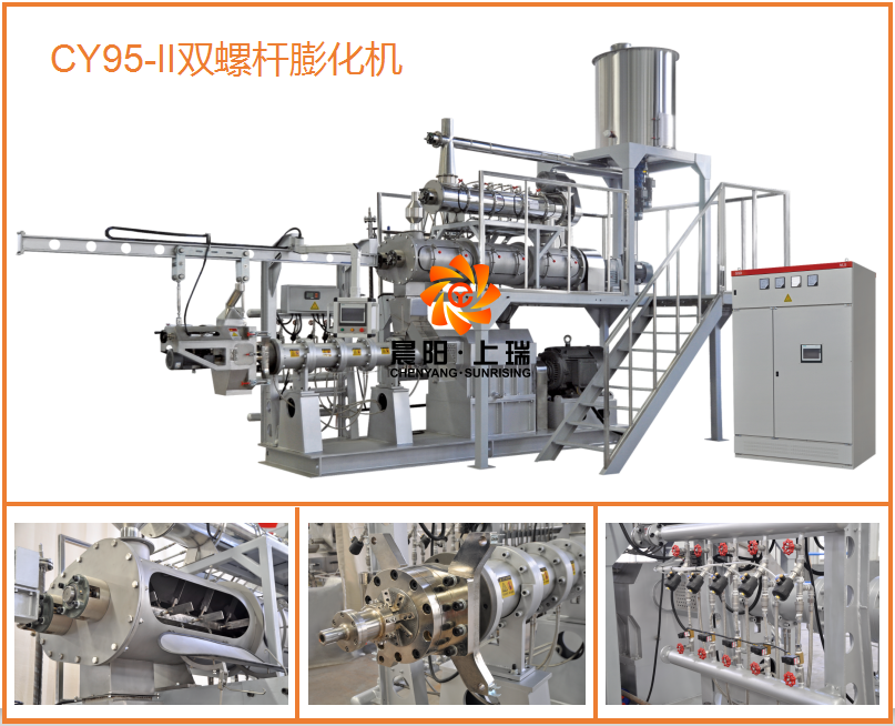 晨陽(yáng)CY95-II雙螺桿膨化機(jī),主電機(jī)搭載110kw,變頻調(diào)速。變速箱使用NSK軸承,南京原裝箱體。使用壽命長(zhǎng),機(jī)筒使用45鋼圓形機(jī)筒內(nèi)鑲嵌合金襯套,文丘里使用38CrmoaL,螺桿長(zhǎng)徑比19.5.整體使用積木組合螺桿,雙頭螺紋,材質(zhì)38CrmoaL。產(chǎn)能2.5T/h,磨損壽命達(dá)2萬(wàn)噸以上,機(jī)器良好的齒輪箱和機(jī)筒螺桿組合可以保證24小時(shí)不停機(jī)生產(chǎn)。膨化機(jī)喂料方式采用圓盤(pán)是破拱喂料器,喂料均勻穩(wěn)定,調(diào)制器使用單軸調(diào)制器加雙軸差速調(diào)制器,調(diào)制效果好,熟化度高,調(diào)制器特別配置鮮肉添加功能,實(shí)現(xiàn)鮮肉狗糧生產(chǎn)功能。膨化機(jī)使用PLC自動(dòng)控制,控制機(jī)筒溫度和其它電機(jī)參數(shù)。調(diào)制器蒸汽、水添加分手動(dòng)控制和自動(dòng)控制,自動(dòng)控制添加可以通過(guò)比例調(diào)節(jié)閥實(shí)現(xiàn)參數(shù)自由設(shè)定化,達(dá)到和5-10噸膨化機(jī)臺(tái)異曲同工之處。