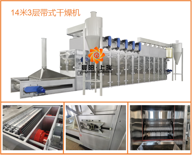 干燥方面,客戶技術(shù)指標(biāo),成品大于2H/h,脫水率:32%降至5%以內(nèi),對(duì)脫水干燥能力具有較高的要求, 晨陽(yáng)干燥機(jī)本次配置14米3層干燥機(jī),帶寬2米,箱室高度達(dá)2.4米,通風(fēng)對(duì)流效果好,中間段12米,2米一節(jié)。使用不銹鋼鏈板網(wǎng)帶,使用壽命長(zhǎng),鏈板基本上沒(méi)有維修率,鏈板沖孔方式使用晨陽(yáng)設(shè)計(jì)的新技術(shù),透風(fēng)性好,支撐能力強(qiáng),托料能力強(qiáng)。一平方承載22.5-35公斤物料。3層鏈板獨(dú)立變頻調(diào)速,烘干停留時(shí)間30-90分鐘。2段控溫,自動(dòng)比例調(diào)節(jié)閥。蒸汽加熱,使用碳鋼無(wú)縫管鋁翅片,散熱好,能源利用高,獨(dú)立變頻的排濕系統(tǒng),濕度數(shù)顯,數(shù)據(jù)化操作。出料端設(shè)計(jì)3米強(qiáng)制冷卻段,迅速降低顆粒表面溫度。確保在后端噴涂前工藝緩沖倉(cāng)不會(huì)因溫度過(guò)高產(chǎn)生熱汽結(jié)團(tuán)