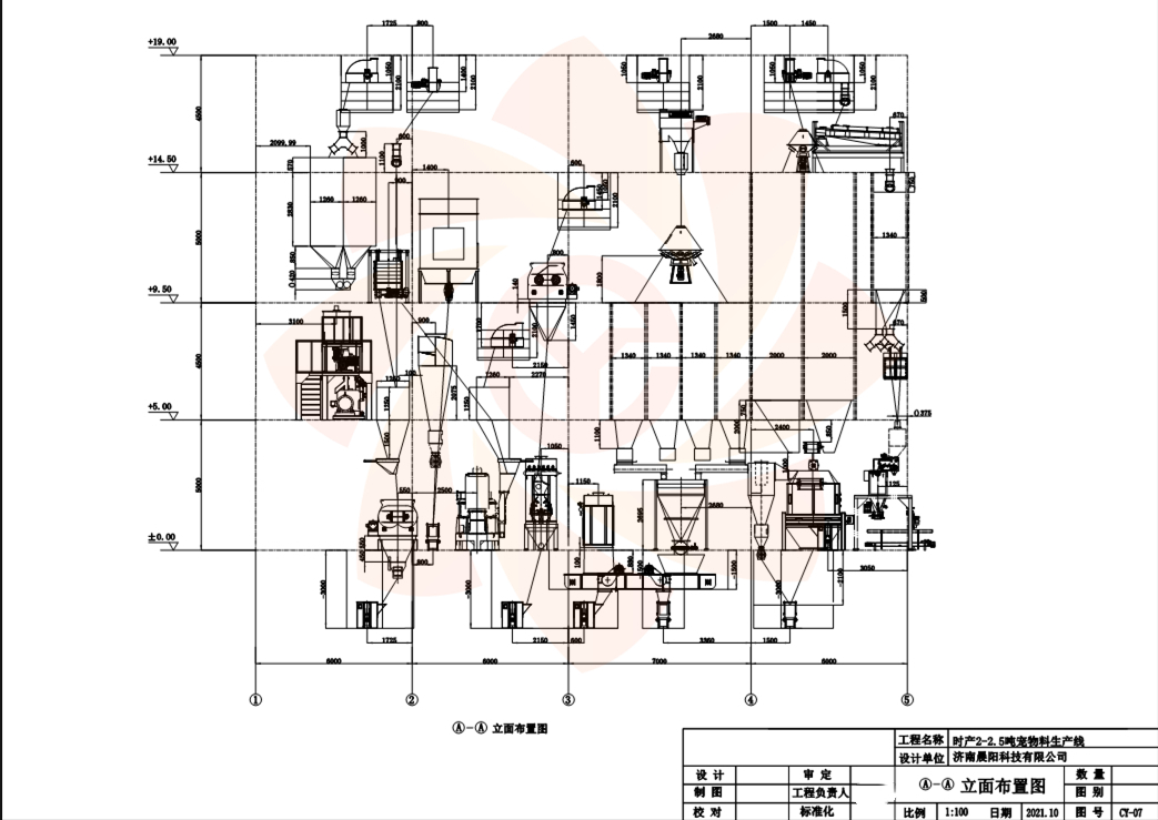 本套2-2.5T/h寵物食品生產(chǎn)線工藝特點(diǎn),因客戶是空地建設(shè),我司設(shè)計(jì)首先考慮工藝流程的順暢,在設(shè)計(jì)上人性化布局,采用4層鋼結(jié)構(gòu)設(shè)計(jì),車(chē)間建設(shè)高度19米(因客戶政府高度限制),工藝方面使用國(guó)內(nèi)主流二次混合,二次粉碎、雙螺桿膨化機(jī)、真空噴涂、逆流冷卻,產(chǎn)品混色,包裝碼垛等全部自動(dòng)流水線。配料倉(cāng)采用12倉(cāng),滿足多種配方配料要求,配料軟件采用布勒系統(tǒng)。配料穩(wěn)定,可儲(chǔ)存多種配方,配料記錄可留檔查詢,原料混合使用雙軸漿葉混合機(jī),混合均勻度≥98%,雙軸混合機(jī)排料殘留低,可保證每批原料的混合均勻度一致,粉碎機(jī)工藝采用粗粉加細(xì)粉,批次粉碎。避免不同原料進(jìn)粉碎機(jī)因過(guò)篩問(wèn)題產(chǎn)生沉降層。粗粉碎使用臥室錘片粉碎機(jī),粉碎細(xì)度20目,產(chǎn)量高。細(xì)粉使用超威粉碎機(jī),刀頭使用鎢合碳化鋼,硬度高。粉碎細(xì)度80目過(guò)篩率95%。保證產(chǎn)品成型表面光滑,無(wú)凹凸顆粒狀。在二次混合添加微量元素和一定比例油脂,提高產(chǎn)品油脂含量。膨化機(jī)使用雙螺桿膨化機(jī),產(chǎn)品穩(wěn)定,烘干使用帶式低溫干燥,微量元素?zé)釗p低,噴涂使用真空噴涂,油脂添加30%。使用翻板逆流冷卻器,冷卻效果好,配置4倉(cāng)暫存?zhèn)},可以存儲(chǔ)4種不同顏色的產(chǎn)品,每個(gè)倉(cāng)存儲(chǔ)可以到6個(gè)小時(shí)膨化產(chǎn)能的產(chǎn)品。可以同時(shí)四個(gè)顏色進(jìn)行混合,包裝方面配置自動(dòng)打包稱,自動(dòng)碼垛機(jī),給帶式包裝機(jī),包裝規(guī)格500g-25kg全部實(shí)現(xiàn)。