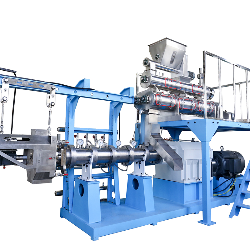 膨化:混合后的物料進(jìn)入雙螺桿擠壓膨化機(jī)。在高溫高壓的條件下,原材料中的淀粉被膨化并轉(zhuǎn)化為可消化的形式。膨化機(jī)通過(guò)調(diào)節(jié)旋切電機(jī)的轉(zhuǎn)速,可以控制飼料顆粒的大小和形狀