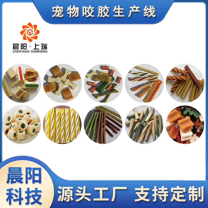 寵物咬膠生產(chǎn)線的核心生產(chǎn)工藝流程包括以下幾個(gè)步驟:原料攪拌、原料輸送、擠出成型熟化、冷卻降溫、切斷成型、多層烤箱熟化、冷卻輸送和包裝。