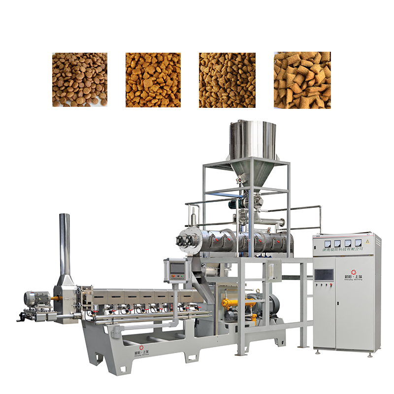 擠壓膨化:核心設(shè)備是雙螺桿擠壓膨化機(jī),通過(guò)高溫高壓環(huán)境將混合好的原料進(jìn)行膨化,形成酥脆的狗糧。這一步驟負(fù)責(zé)將混合好的原料經(jīng)過(guò)高溫高壓處理,形成的質(zhì)地和口感
