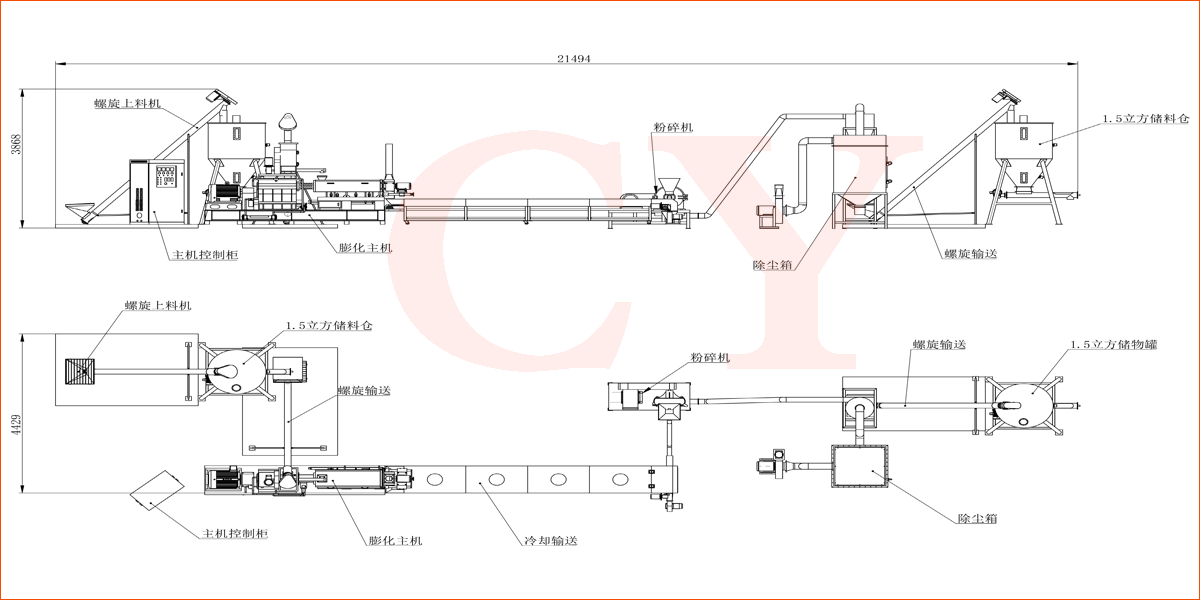 生產(chǎn)線構(gòu)成:拌粉機→螺旋提料機→膨化主機→冷卻輸送機→除塵粉碎機
