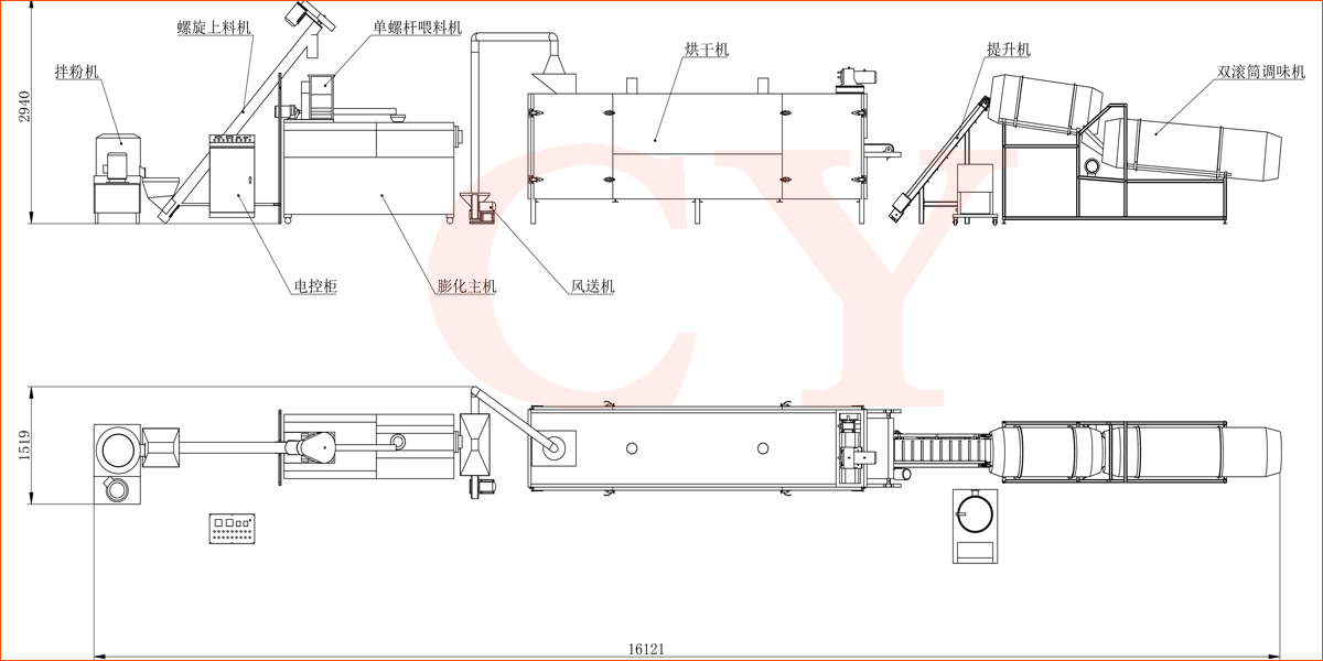 拌粉機(jī)→螺旋上料機(jī)→雙螺桿膨化機(jī)→風(fēng)送機(jī)→三層烤箱→中提升機(jī)→-雙滾筒調(diào)味機(jī)→電子包裝機(jī)
