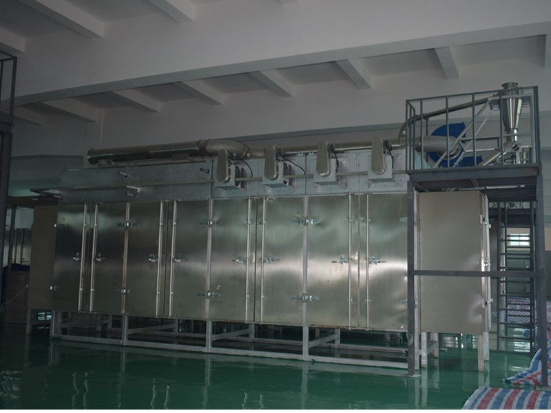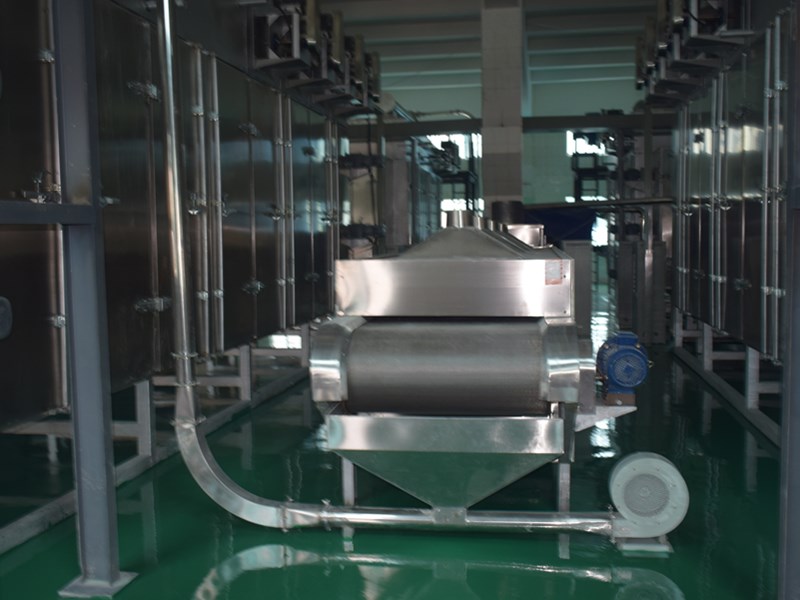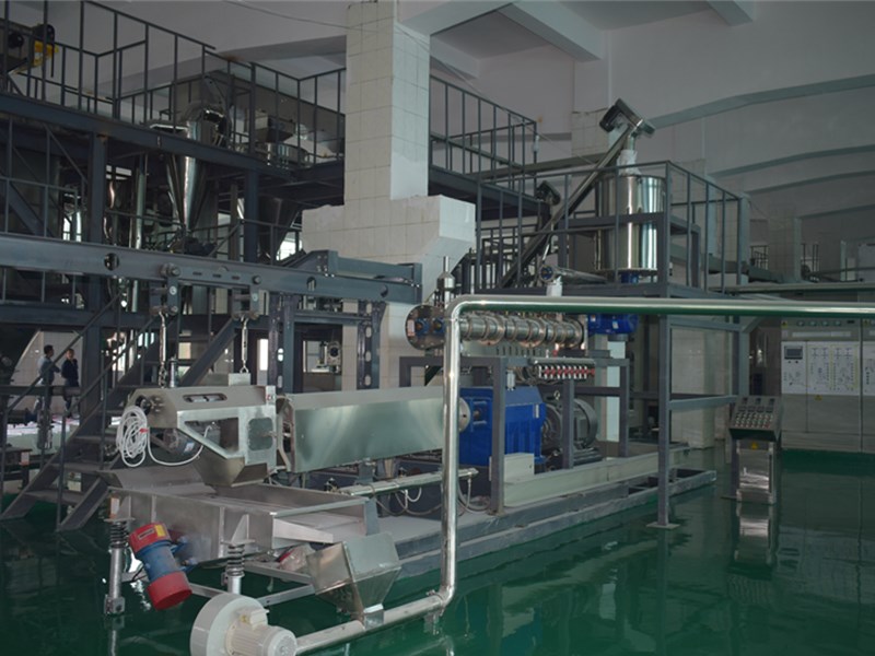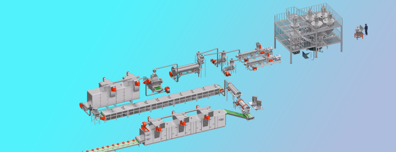 拌粉機→螺旋提料機→膨化主機→振動篩→風(fēng)送機→壓片機→風(fēng)送機→冷卻攤料機→五層烘箱→提升機→震動攤料機→高溫烘干機→提升機→單滾筒噴涂線→烘箱→冷卻輸送機