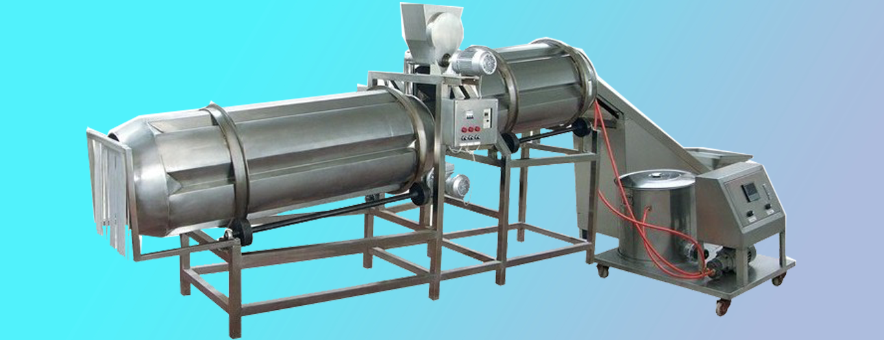 雙滾筒調(diào)味設(shè)備主要用于休閑膨化食品、寵物食品的表面噴油與調(diào)味,具有產(chǎn)量高,可連續(xù)作業(yè)等特點。個滾筒前端先噴油,物料表面有粘性后 在滾筒中端再撒入調(diào)味粉,調(diào)味粉可以更好的黏附在產(chǎn)品表面。第二滾筒充分混合,使物料表面黏附均勻